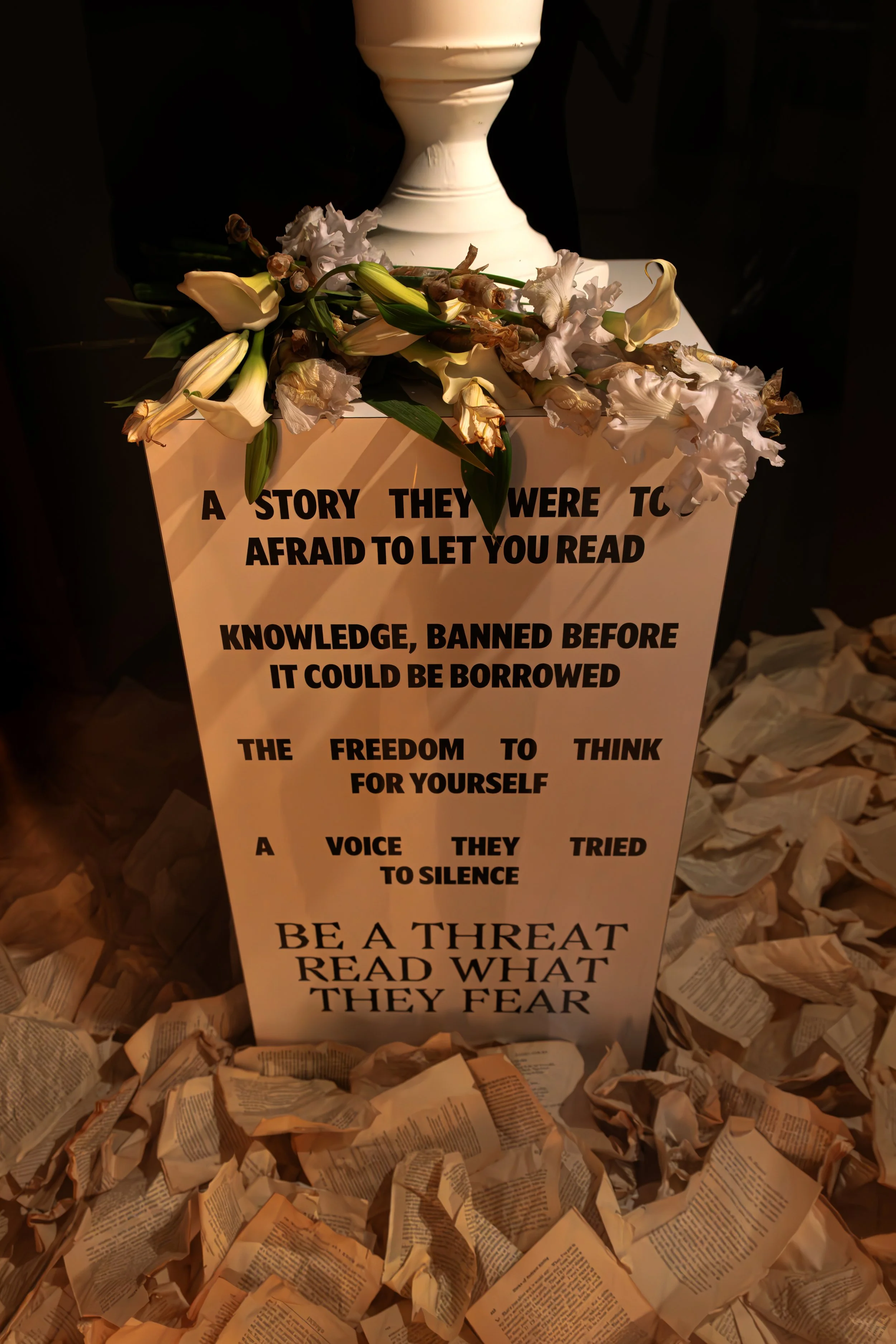 On May 20, 2025, as part of the NYCxDESIGN Festival, we transformed our Flatiron studio into a rallying ground for banned ideas; equal parts installation, rally, and call to resist. From the moment guests entered the building and received a postcard depicting a dead canary stamped over the word CENSORSHIP, they were asked to confront the stakes. Inside the event, over 200 artists, designers, and cultural agitators navigated an immersive, tactile experience where participation was the point.Guests gathered around a screen printing demo by Bushwick Print Lab, where pulled poster templates became the foundations for protest. Participants filled in the blanks on these prints, alongside an additional design donated by Kayrock Screenprinting. In a separate room, The Dead Library stood in solemn contrast: an enclosure of an urn surrounded by wilted flowers and torn book pages stood guard, memorializing renowned authors, titles, and stories currently facing the threat of erasure by local and national bans. At the center of the space stood the Riot Wall: a sea of typographic posters that transformed erased language into graphic confrontation.