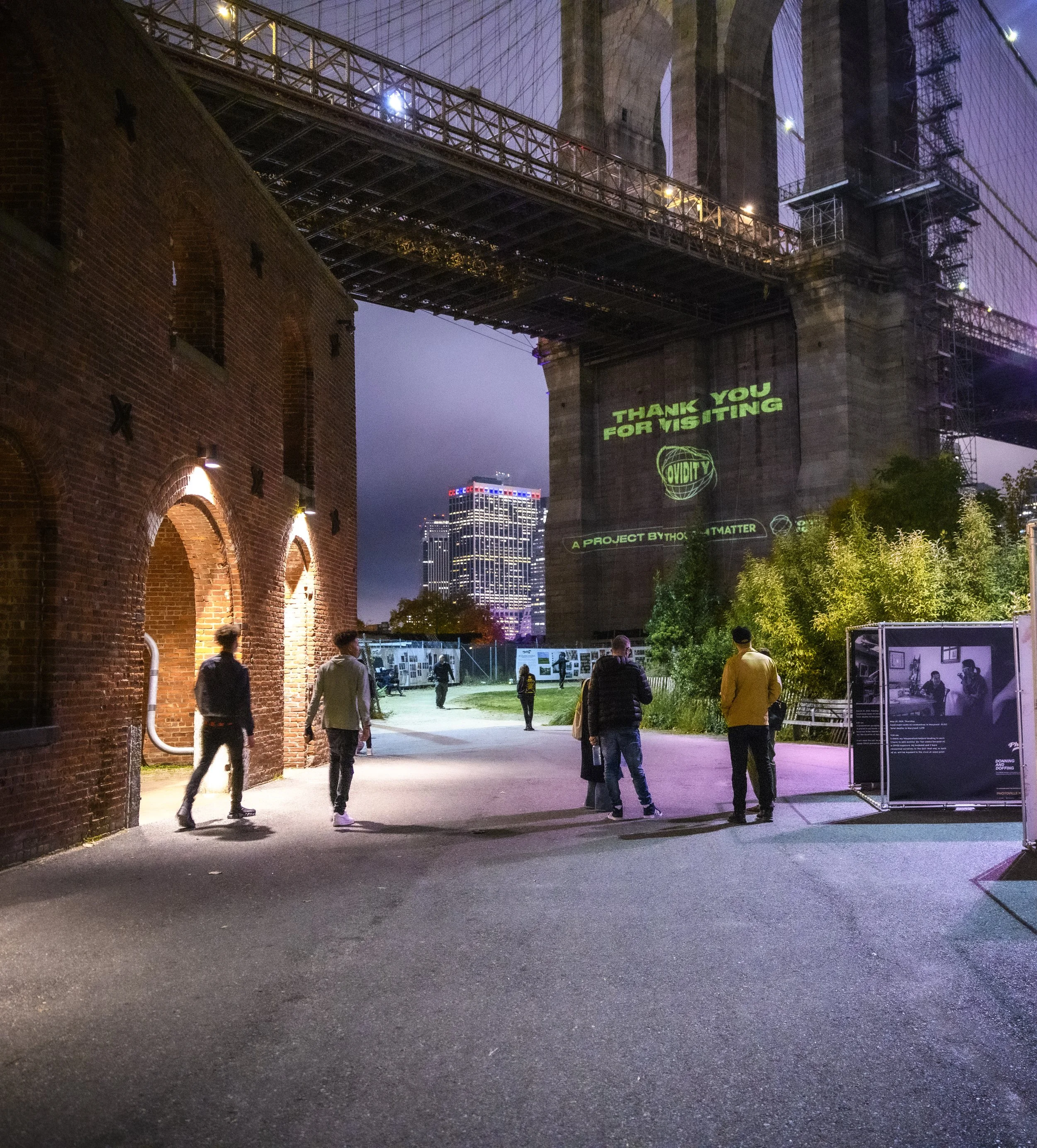 Working remotely, we gathered fragments of feeling that emerged from a ruptured social fabric: headlines, conversation snippets, journal entries and Slack messages. These artifacts were internal logs of anxiety, rage, isolation and hope. We filtered this material through the lens of typography, motion and abstraction, creating an immersive video projection broken into six surreal worlds that represented the pandemic’s psychological effects. The name “Covidity” reframed the COVID-19 pandemic as a condition of being, a contradicting convergence of angst, stillness, overload and rare moments of clarity. We screened an accompanying animated short film in iconic locations in Manhattan and Brooklyn: in the shadow of the Brooklyn Bridge in DUMBO, on the corner of East Houston Street and Broadway and in Nolita and Williamsburg. These communal screenings created fleeting but powerful public monuments.